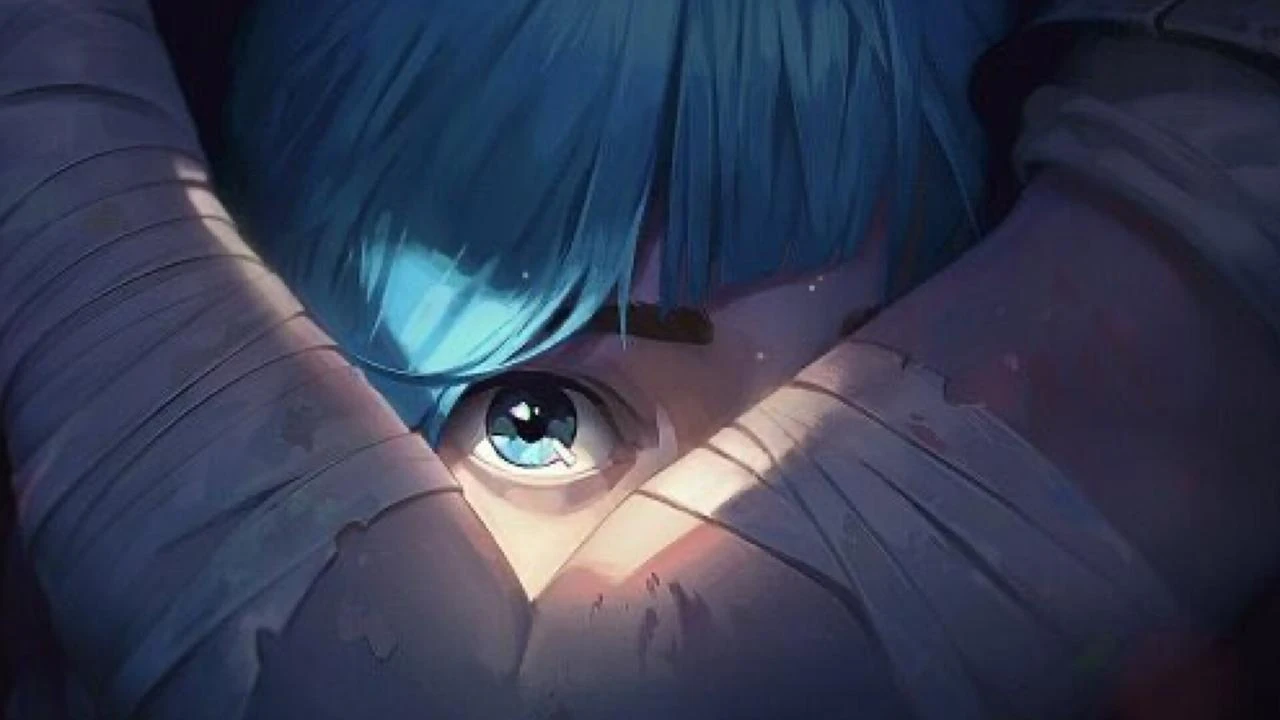 Jinx’s iconic blue braids and intense gaze, reflecting her fractured psyche